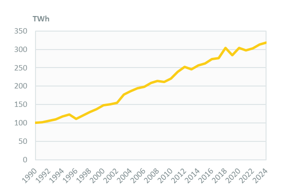 Electricity consumption has been increasing by around 2.5%/year on average since 2013, reaching 319 TWh in 2024.