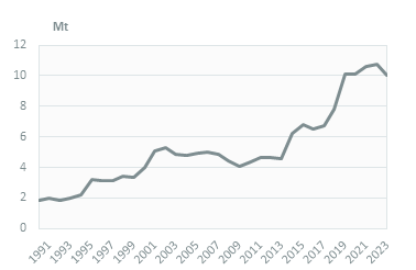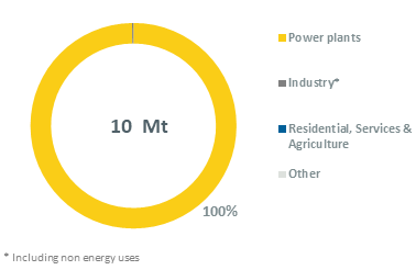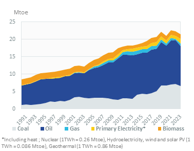Coal consumption has remained stable at around 10 Mt since 2019 (-7% to 10 Mt in 2023). Coal consumption surged (+14%/year) between 2013 and 2019 with the commissioning of new coal power plants. Coal is entirely used for power generation.