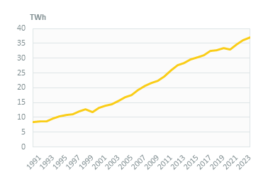 Electricity consumption is increasing rapidly, doubling since 2005 with the implementation of the electrification programme to 37 TWh in 2023 (+3.5%/year since 2010). Electricity consumption increased by around 1.5% in 2024, according to preliminary estimates.