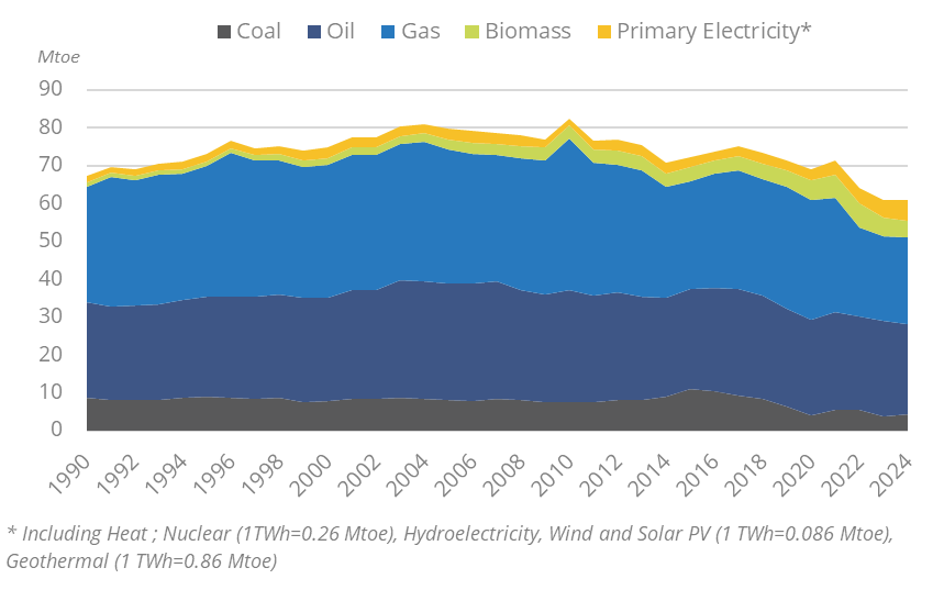 Total energy consumption has been decreasing slightly since 2021 (-3.9%/year), reaching 61 Mtoe in 2024. It was decreasing over 2016-2019 (-0.8%/year), after a slight growth between 2014 and 2016 (+1.5%/year) thanks to the economic recovery, and a decrease by more than 1%/year between 2007 and 2014 due to the economic slowdown.