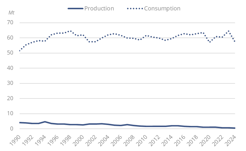 Crude oil production is low and decreasing (0.6 Mt in 2024). Crude imports (57 Mt in 2024) mainly came from the US. The share of Russia dropped from 31% in 2021 to 0.5% in 2022; in 2023, there were no imports from Russia.