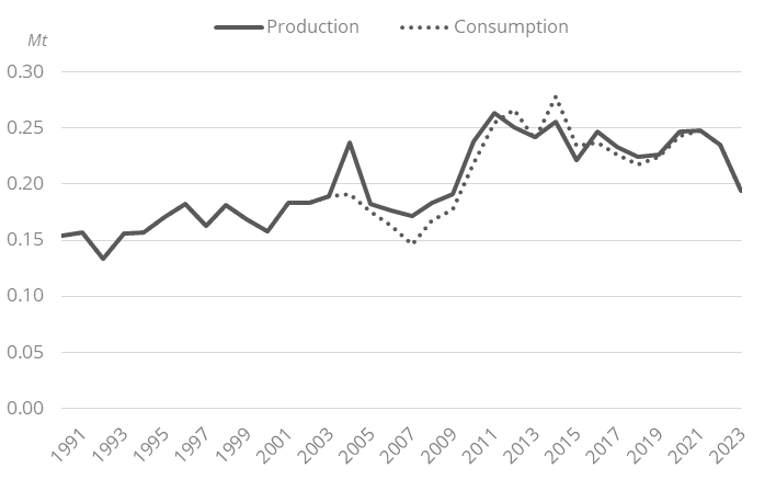 Coal production is low (0.2 Mt in 2023, -18% compared to 2022) and declining (-1.6%/year since 2010). It is almost entirely consumed domestically for the production of electricity (97% in 2023).