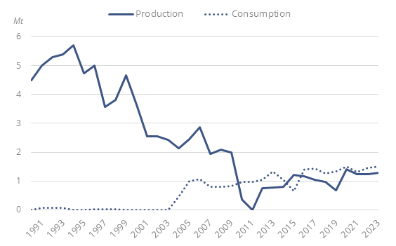 Crude oil production has increased by 2%/year since 2021 to 1.3 Mt/year in 2023. It rose rapidly from 2010 to 2020 (15%/year), reaching 1.4 Mt. Before 2010, it declined steadily from around 3.6 Mt in 2000 to 2 Mt in 2009.