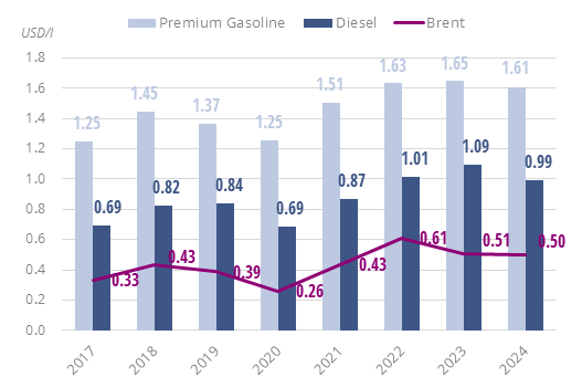 In 2024, the price of diesel reached US$0.99/l (-9%) and that of gasoline US$1.61/l (-2%). Prices have increased regularly since 2020 (+28% for gasoline and +45% for diesel)