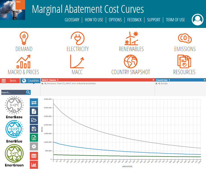 Enerdata’s long-term Marginal Abatement Cost Curves (MACC) allow you to gain unique insight and comprehensive data from the globally recognised POLES model. MACC are used to help shape GHG mitigation policies, set targets, evaluate future CO2 emission credits, prices and volumes.