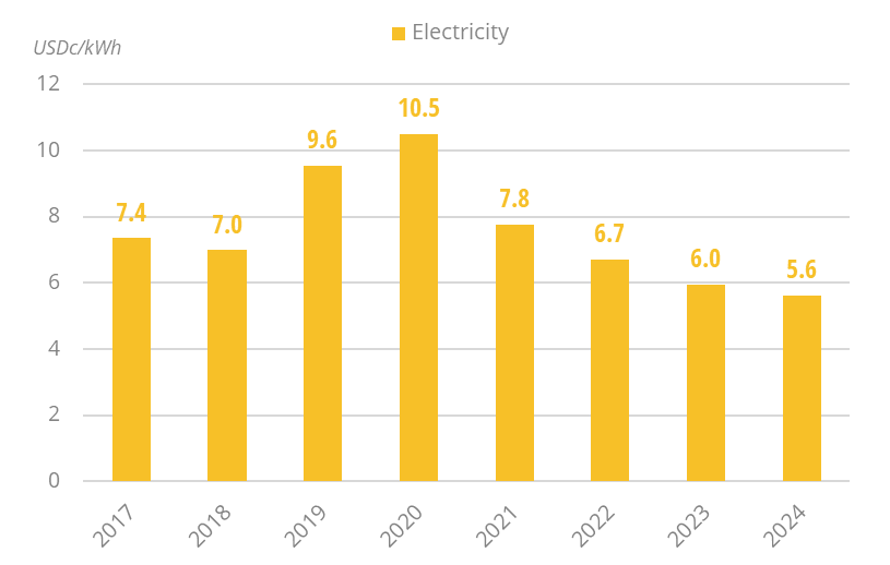 Electricity tariffs are fixed by the Government. The price of electricity for industrial customers has been decreasing since 2020 (-9%/year), reaching US$5.6c/kWh in 2024.