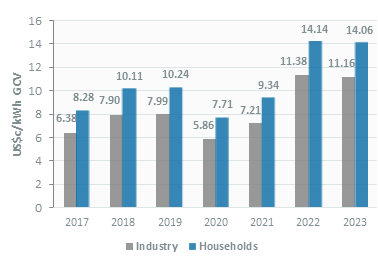 Graph: GAS PRICES FOR INDUSTRY AND HOUSEHOLDS (US$c/kWh GCV)